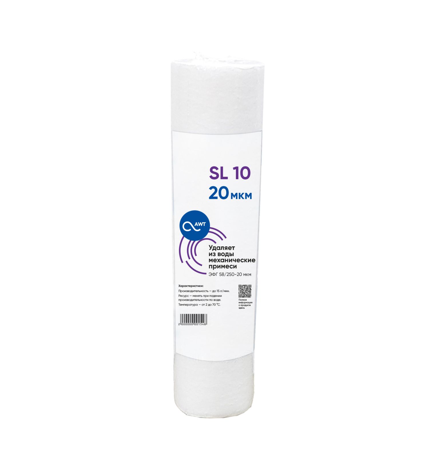 Купить картридж механической очистки AWT ЭФГ 63/250-20 (SL10) — фильтрующий элемент из полипропилена для эффективного удаления из воды песка, ржавчины, грязи и других нерастворимых примесей. Картридж подходит для систем стандарта SL10, рассчитан на работу с холодной и горячей водой, а глубинная структура материала обеспечивает высокую грязеёмкость и стабильную производительность. Практичное решение для тех, кто хочет заказать картридж механической очистки SL10 для бытовой или коммерческой системы водоподготовки.